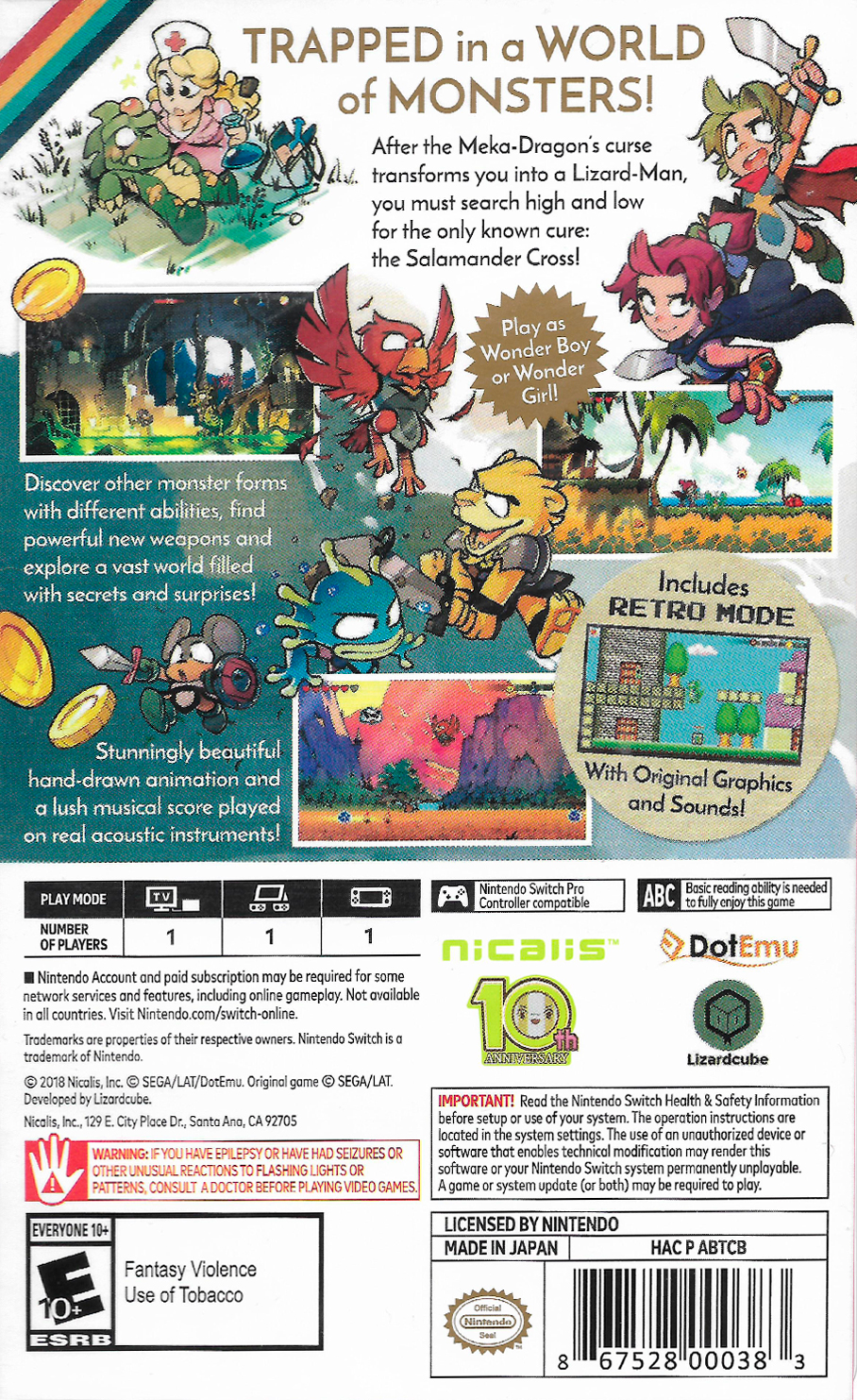 Wonderboy: The Dragons Trap contiene un hermoso diseño en la animación remasterizada del inolvidable Wonderboy III para Sega Master System. El juego desarrollado por Lizardcub contiene y respeta al juego original, replicando la función, los movimientos, las contraseñas, las locaciones de las puertas secretas y mucho más.