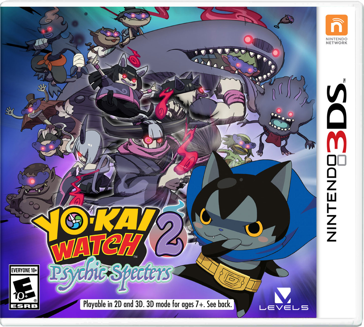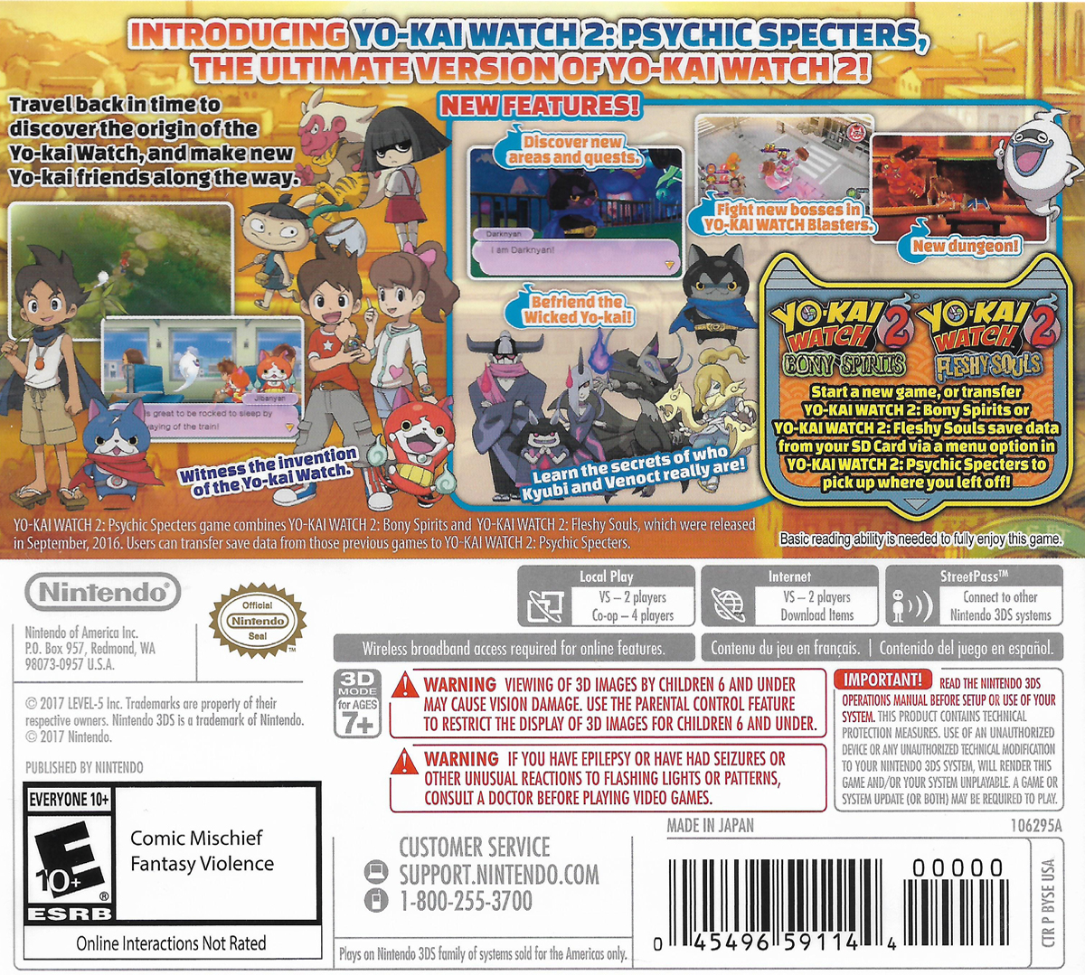 Batalla en línea o vía inalámbrica local ** para ganar recompensas en el juego por tu aventura. ¡O toma el control de un Yo-kai en Psychic Blasters, un modo de acción de 4 jugadores mejorado! Si eres el dueño del juego YO-KAI WATCH ™2: Bony Spirits o YO-KAI WATCH 2: Fleshy Souls, puedes transferir datos guardados de tu sistema familiar Nintendo 3DS a YO-KAI WATCH 2: Spectres psíquicos