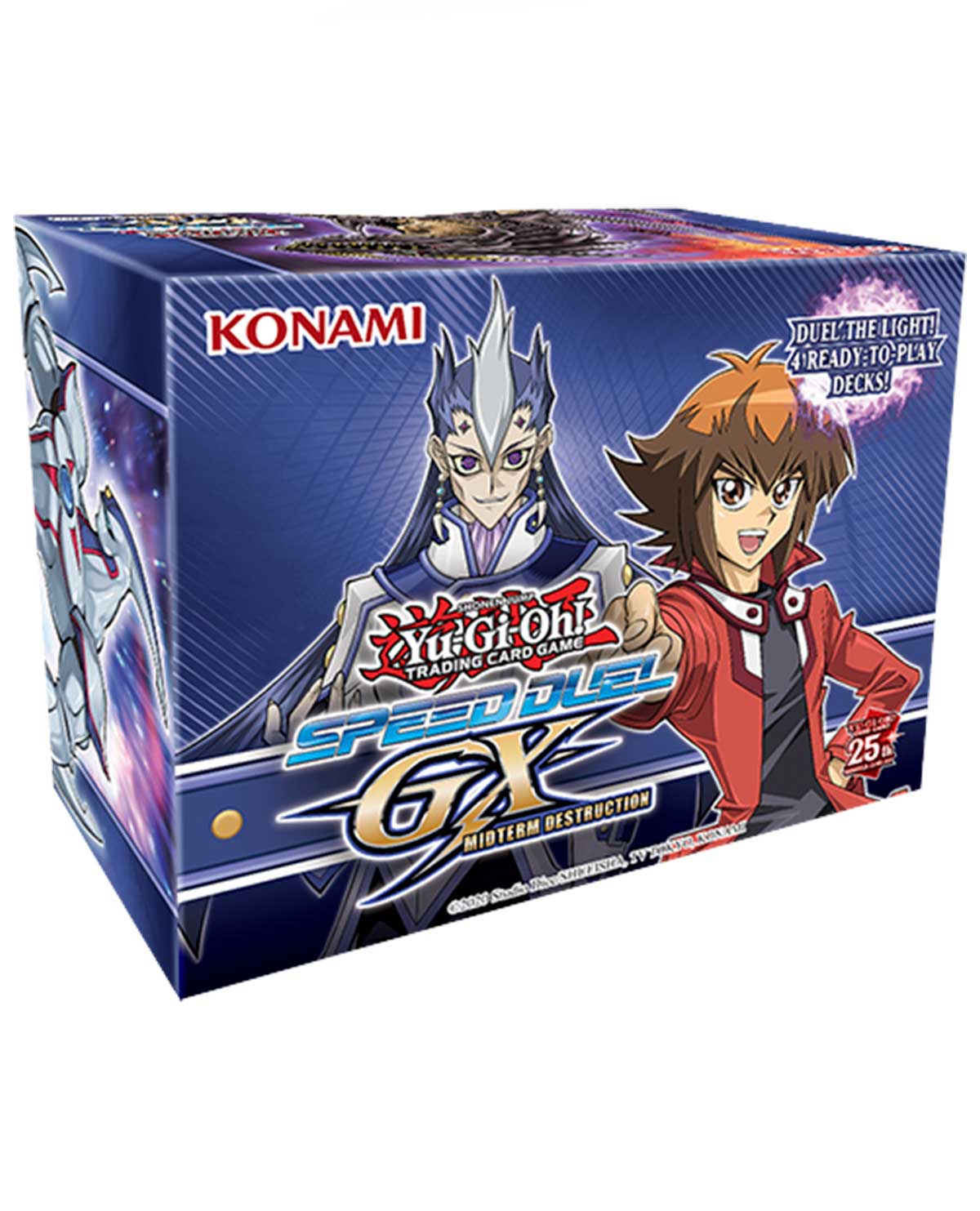 Speed Duel GX: Midterm Destruction presenta nuevas cartas y estrategias de Yu-Gi-Oh! ¡Serie animada GX! Con 4 barajas Speed Duel completas listas para jugar nada más sacarlas de la caja y más de 90 cartas nuevas en Speed Duel, ¡esta es una colección que los Speed Duelists no querrán perderse!